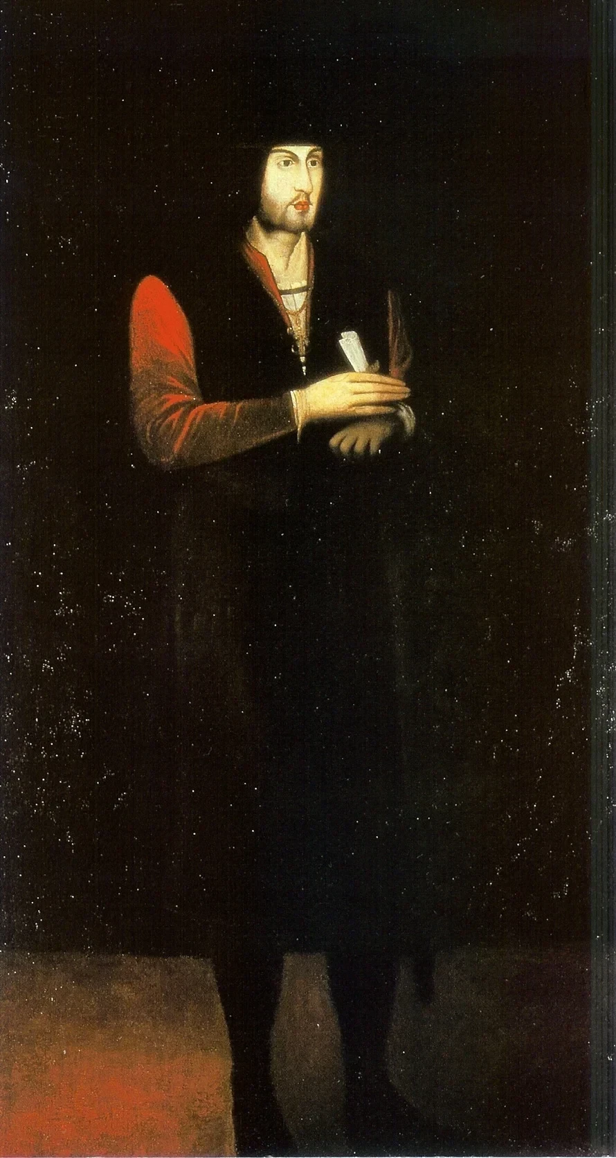 D Joao II retrato sec XVIIO cronista Rui de Pina conta que, no dia marcado, o duque de Bragança — que pouco antes se gabava de poder levantar em armas três mil cavaleiros e 10 mil soldados a pé nas 25 vilas e fortalezas de que era senhor — foi conduzido à praça principal daquela cidade alentejana onde, no meio de um enorme aparato “chegou a ele por detrás um homem grande, todo coberto de dó que lhe não viram o rosto, o qual se afirma não ser algoz, e ser homem honrado, que estava para o justiçarem e por esta justiça em tal pessoa foi perdoado, e com uma toalha de Holanda que trazia na mão lhe cobriu os olhos e, com muita honestidade, o lançou de costas, pedindo-lhe primeiro perdão; e acabado um espantoso pregão que um rei-de-armas dizia e dois pregoeiros em alta voz davam, o homem, com um grande e agudo cutelo que tirou debaixo da loba, perante todos lhe cortou a cabeça”.